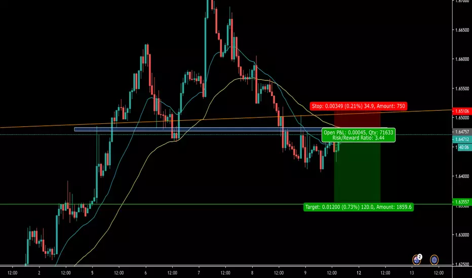 My reasons for this trade are: on weekly we can see price is looking to close as an inverted hammer (still waiting on close). On daily we had a strong bearish close yesterday showing momentum to the downside, it also closed back into my daily channel. We have seen some exhaustion on 4H between the 20EMA and 50EMA. Price is looking to test the 4H 20EMA at my zone, which lines up with 78.6% fib retracement from the previous wick high. On 1H we can see the blue zone has had many rejections over the last few days, the 1H 50EMA is also approaching this zone where I will be looking to short to 1.6355.