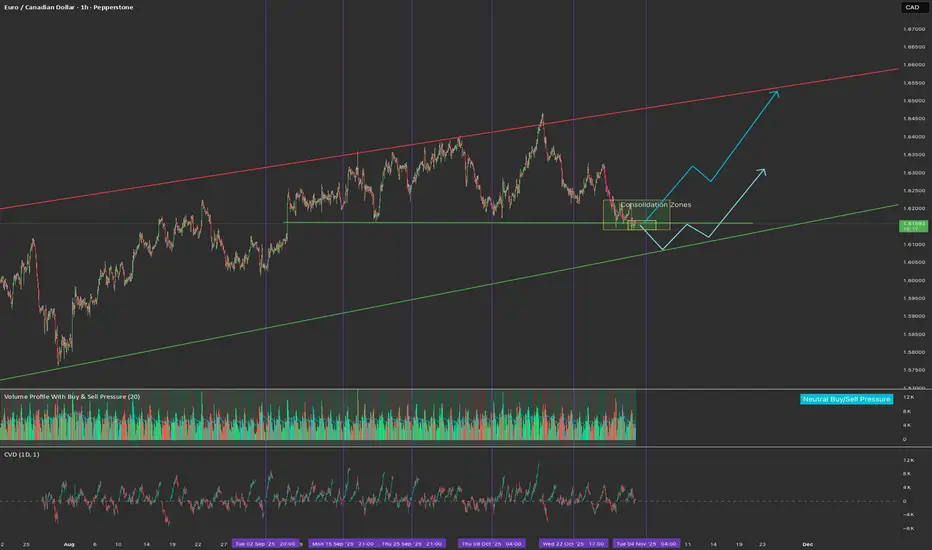 Analyzing the EUR/CAD chart, price action has reached a key support level and is currently consolidating within a narrow range, itself contained within a broader consolidation pattern. While the next directional move remains uncertain, my strategy is as follows: