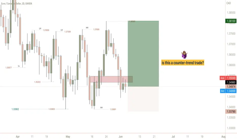 If you scale up to the higher timeframe, you will see the weekly timeframe is in a downtrend. It is making lower lows and lower highs. So any buy you enter on the lower timeframe at this point will be categorized as a counter-trend trade.