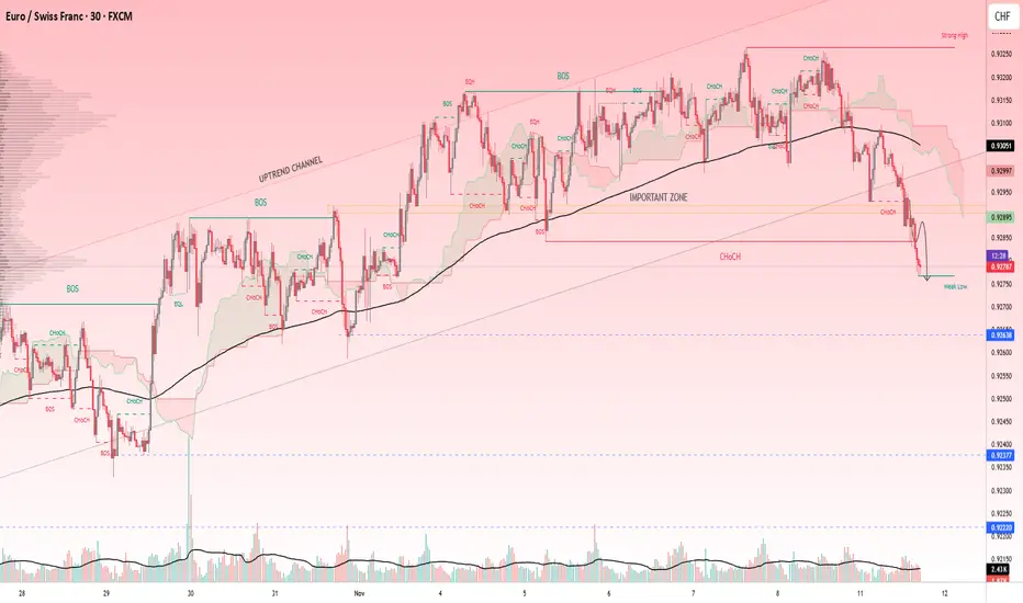 EURCHF Trade Update | Targets Achieved EURCHF has executed the full downside projection following the uptrend channel breakdown, hitting all technical targets with clean bearish momentum and no significant counter-moves. The pair respected the structure below 0.9300, confirming seller control through the important support breach at 0.9270–0.9280.