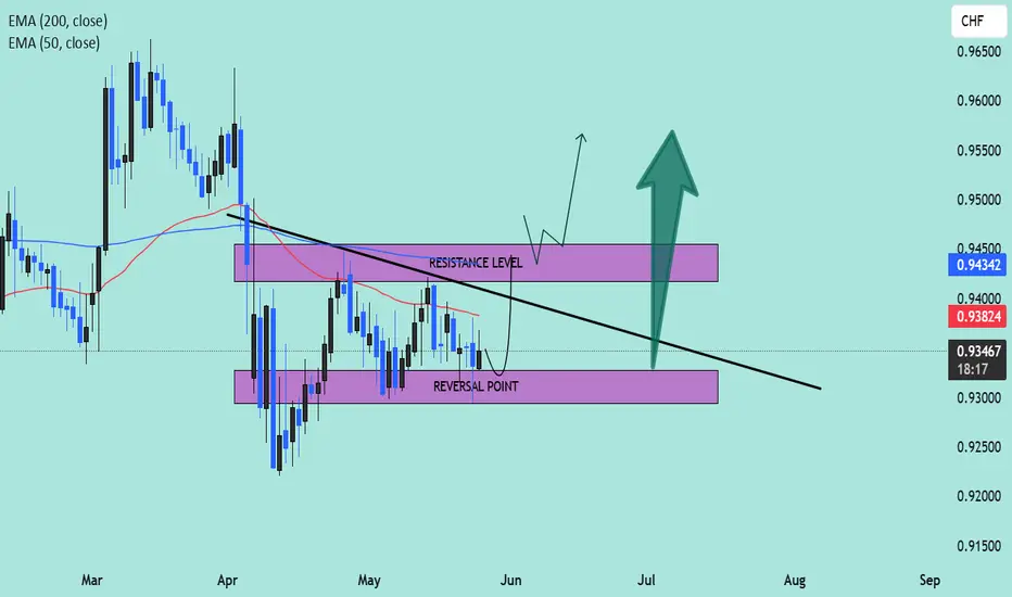 This chart suggests a critical decision point for EUR/CHF. A bounce from the reversal zone followed by a confirmed break above resistance could signal the start of a medium-term uptrend. Traders should monitor price action closely for confirmation signals near the trendline and EMA zones.