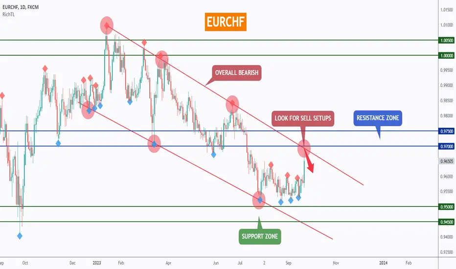 EURCHF has been overall bearish trading inside the falling channel in red, and it is currently approaching around the upper trendline.