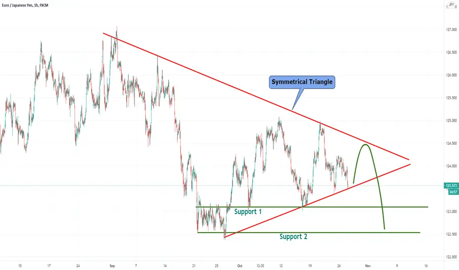 EURJPY is forming a Symmetrical Triangle Pattern, which indicates incisiveness in trend. According to chart pattern analysis, we might see a breakout in EURJPY on the downside. One can initiate the short trade once price breakout of pattern with risk management and stop loss.