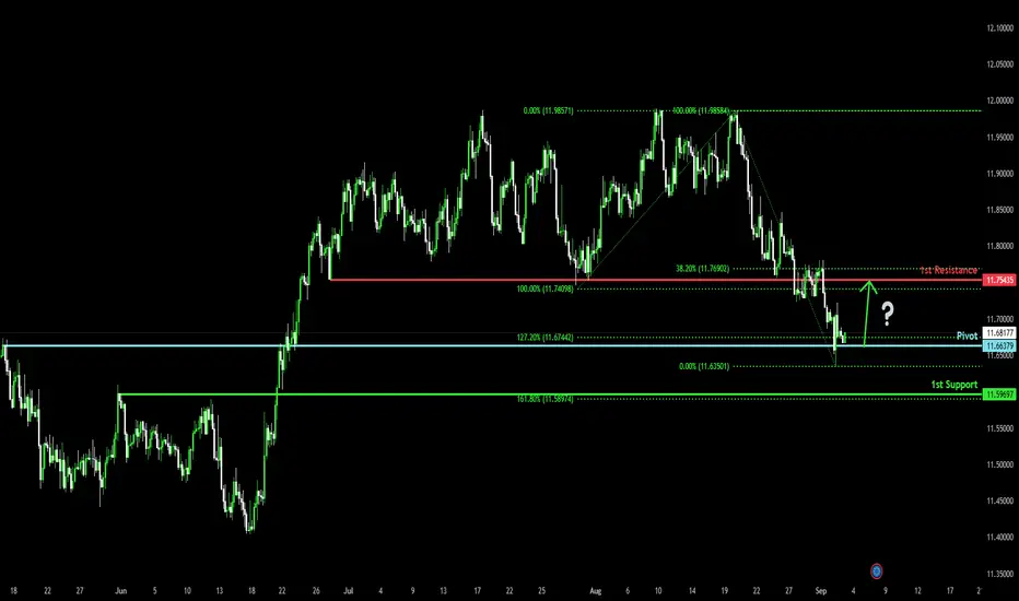 EUR/NOK is reacting off the pivot which acts as a pullback support that lines up with the 127.2% Fibonacci extension and could reverse to the 1st resistance which is a pullback resistance.