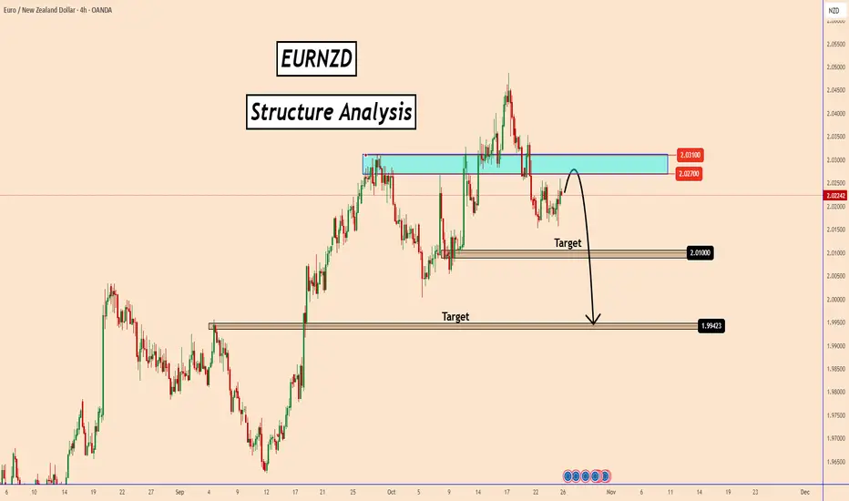 EURNZD is currently testing a key resistance zone between 2.0270 and 2.0310, an area that has acted as a strong supply zone in the past. The pair has shown multiple rejections around this level, suggesting that buyers are losing momentum and sellers may soon regain control.