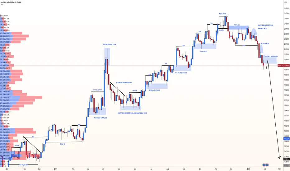 EURNZD has been declining since NZD became the strongest currency at the current market. Our two entries are currently performing well but there’s a strong chance the price will drop around 1920+ pips. This would be one of the biggest drops EURNZD could experience. The timeline for this trading setup to complete is by 2026. It’s also not confirmed and the price could take longer to reach our take profit.