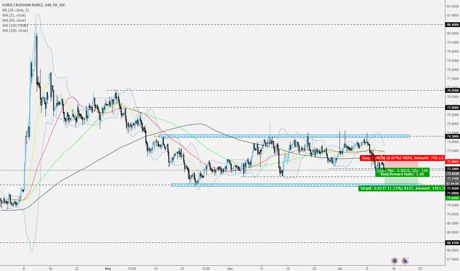 Recently, ideally, we should wait for a break of one of the highlighted sides, in order to take a position, but because EURRUB continues to slide slowly, we could see another move a bit lower, towards the 71.60 zone.