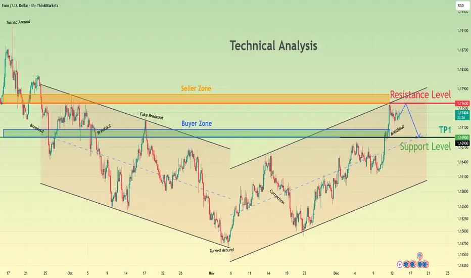 Hello traders! Here’s my technical outlook on EUR/USD based on the current chart structure. After a prolonged bearish move inside a downward channel, EURUSD found a base and reversed from the lower boundary, signaling a loss of bearish momentum. The price then broke above the descending resistance and entered a recovery phase, forming a higher low structure. Following this shift, EURUSD moved into a rising channel, where buyers have been gradually gaining control. Currently, price has pushed into the 1.1760 Resistance Zone (Seller Zone), which previously acted as a strong supply area. The market has already shown signs of rejection from this level, suggesting sellers remain active. Below the current price, the 1.1690–1.1670 Support Level (Buyer Zone) acts as the key demand area and aligns with the lower boundary of the rising structure. As long as EURUSD holds below the resistance, a pullback toward the support zone (TP1) is likely. A deeper correction would still be considered healthy as long as the price remains above structural support. However, a clean breakout and acceptance above 1.1760 could invalidate the short-term bearish pullback scenario and open the way for further upside. For now, the market favors a corrective move, with resistance at 1.1760 and support around 1.1690 as the key levels to watch. Please share this idea with your friends and click Boost 🚀