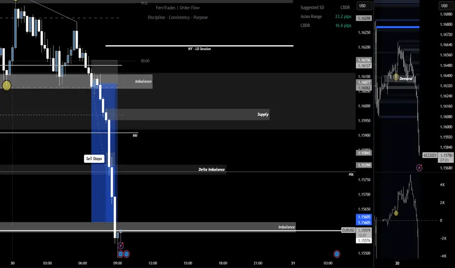 Imbalance and Sell Stops: On the EURUSD CFD chart, a clear delta imbalance and a cascade of sell stops below a key level indicate aggressive shorting and stop-loss liquidity being absorbed, reinforcing bearish bias.