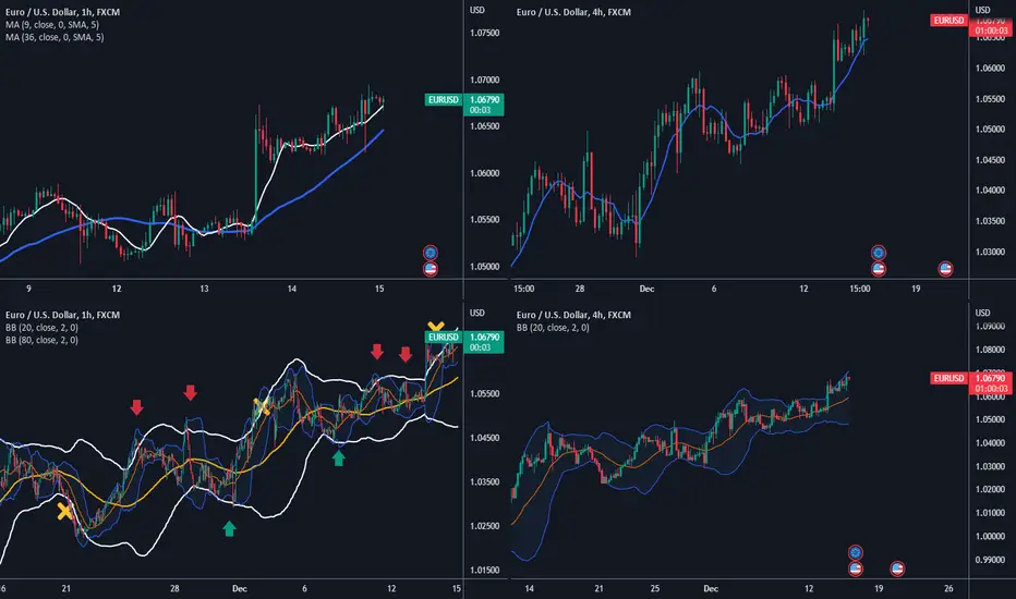 In the UP Right you have a 4 H chart with a 9 period Moving Average. And in the UP left side, you have a 1 hour chart with a 9 MA and a 36 MA, or 9x4=36.