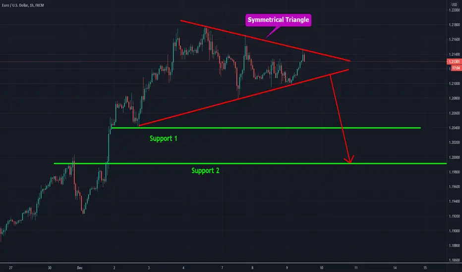 EURUSD is forming a symmetrical triangle pattern at resistance level . Symmetrical pattern indecisiveness in direction of trend. According to chart pattern analysis, we might see downside breakout from triangle pattern . One can initiate the short trade at resistance level with risk management and stop loss.