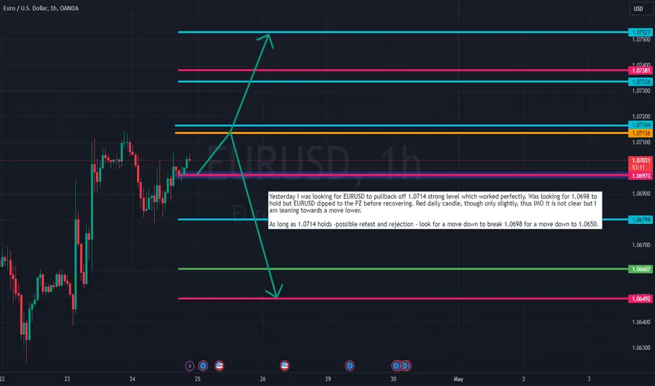 Yesterday I was looking for EURUSD to pullback off 1.0714 strong level which worked perfectly. Was looking for 1.0698 to hold but EURUSD dipped to the PZ before recovering. Red daily candle, though only slightly, thus IMO it is not clear but I am leaning towards a move lower.