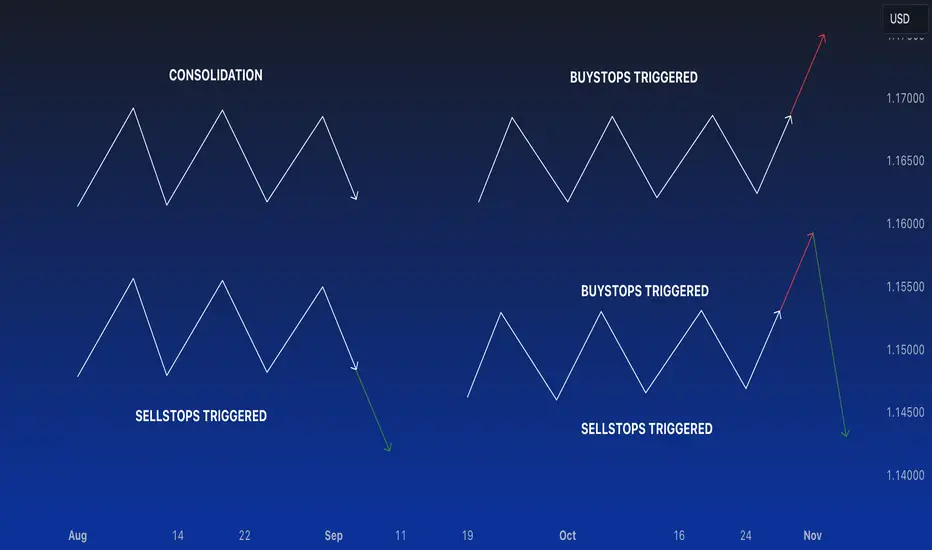"Everything starts with consolidation": IPDA (Interbank Price Delivery Algorithms) keeps the price within a range. This allows liquidity to accumulate above the consolidation range in the form of buy orders and below the consolidation range in the form of sell orders. This phase is known as the accumulation phase. Subsequently, IPDA reprices above the consolidation range, triggering buy orders into active market orders. This is known as the manipulation phase (often referred to as the Judas swing). Smart money will match liquidity from willing buyers (buy orders) with short positions and offload these positions to willing sellers below the consolidation range (sell orders). This is known as the distribution phase.