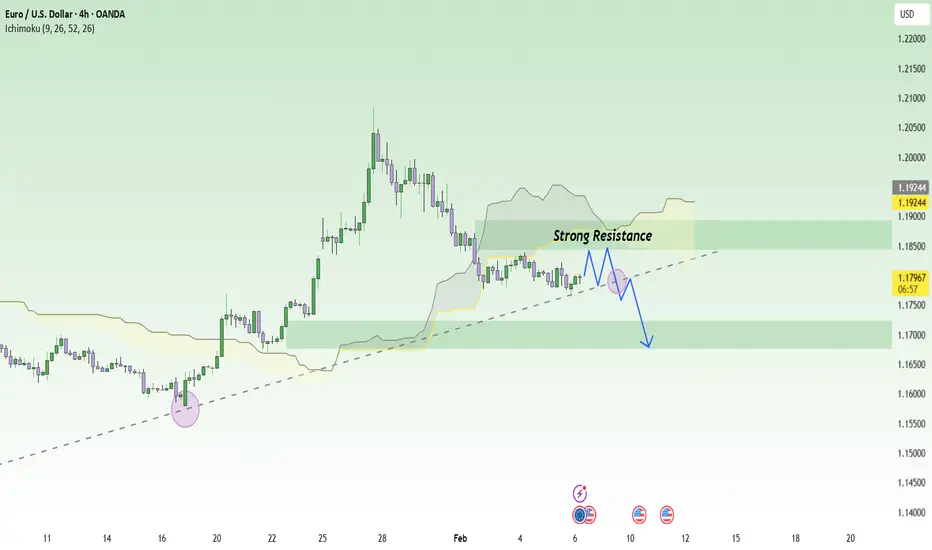 On the chart, after the strong rally at the end of January, price has entered a corrective phase and is now trading below the Ichimoku cloud. This signals that bullish momentum has faded, and the market is shifting into a “technical rebound within a short-term downtrend”. Recent candles are compressing around the 1.17–1.18 zone, which may look like accumulation, but in reality it is more likely consolidation before a downside break if price fails to clear overhead resistance.