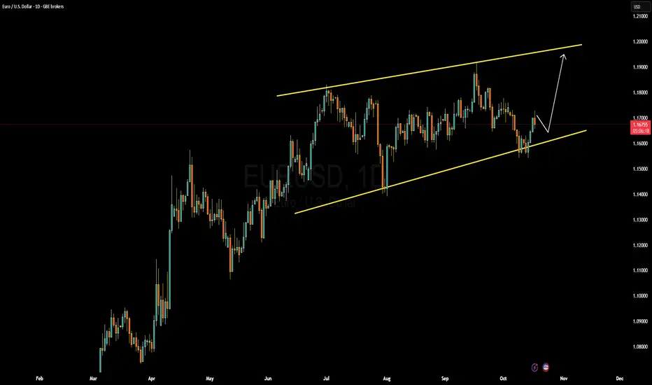 EURUSD is currently respecting a well-defined ascending channel on the daily chart, with price recently bouncing from the lower boundary near the 1.1600 zone. This area has acted as a strong demand region multiple times, signaling active buying pressure from institutional players. The pair is now retracing upward, but I anticipate a short-term pullback before continuation toward the upper channel resistance around the 1.1950–1.2000 region. As long as price holds above the rising trendline, the bullish structure remains intact, offering a high-probability trend continuation setup.