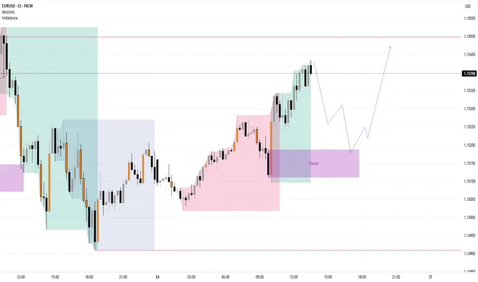 The preferred entry approach is a reaction from the 1.15191 orderblock, but only if the market provides proper confirmation. This includes a clear 15-minute candle close inside the zone, combined with a strong rejection signal, indicating that buyers are defending the level and absorbing sell-side liquidity.