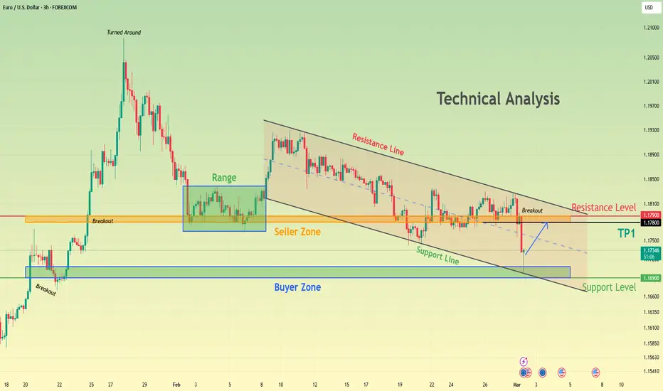 Hello traders! Here’s my technical outlook based on the current EURUSD (3H) chart structure. Price previously advanced after a strong bullish impulse, breaking above a prior resistance area and establishing a short-term uptrend. Following this breakout, the market entered a consolidation phase, forming a horizontal range that reflected temporary balance between buyers and sellers. This range later resolved to the downside, and price transitioned into a descending channel where sellers regained control and the structure shifted toward lower highs and gradual downside pressure. During this bearish phase, multiple attempts to recover were capped by the falling resistance line, confirming that supply remained dominant. The decline eventually slowed as price approached the highlighted Buyer Zone, which aligns with a strong historical support area and the lower boundary of the channel. From this demand zone, EURUSD produced a rebound and attempted to reclaim the mid-range resistance around 1.1780, signaling that buyers were stepping back into the market. Currently, price is trading near the channel resistance while testing the former breakout level, which now acts as a key pivot zone. The market structure suggests that this area is critical for short-term direction: acceptance above it would indicate strengthening bullish momentum, while failure to hold could reinforce the broader descending structure. The reaction from this level will likely determine whether the recent bounce evolves into a deeper recovery or remains a corrective move within the downtrend. My primary scenario favors a cautious bullish recovery while price holds above the buyer zone and channel support. A confirmed move back above the 1.1780 resistance level could open the path toward the upper channel boundary and prior supply area. However, if price fails to maintain support and breaks below the buyer zone, bearish continuation would become more likely, exposing lower demand levels and reinforcing the descending trend. For now, the market remains at a decision point between recovery and continuation, so confirmation is key. Please share this idea with your friends and click Boost 🚀
