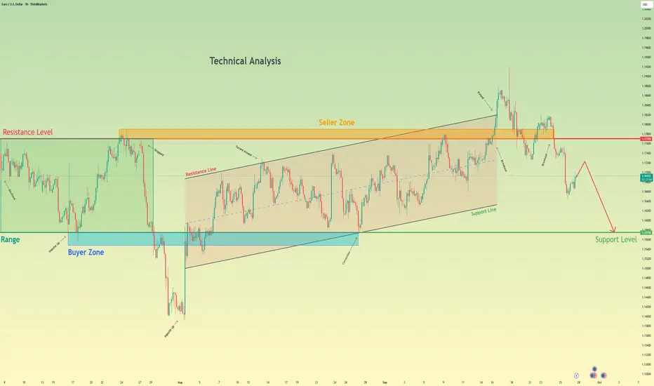 Hello traders, I want share with you my opinion about Euro. The market for the Euro has recently shown a significant sign of weakness, with a failed breakout above the key 1.1770 Resistance Level. After a sustained rally within an upward channel, the price of EURUSD pushed into the 1.1770 - 1.1790 seller zone but failed to find acceptance, quickly reversing back below the broken levels. This 'bull trap' has invalidated the immediate bullish momentum and shifted the short-term market structure to a bearish bias. Currently, after the initial sharp decline from the highs, the asset is in a minor corrective bounce. In my mind, this price action represents a low-momentum pause before the next wave of selling. I expect that this small upward movement will soon be exhausted, and the price will continue its bearish movement downwards. A failure to produce a strong rally from these levels confirms that sellers have regained control. Therefore, I have placed my TP for this trend-continuation scenario at the major 1.1575 support level. This target is a logical objective, as it represents the next significant area of historical support and aligns with the 1.1575 - 1.1548 buyer zone. Please share this idea with your friends and click Boost 🚀