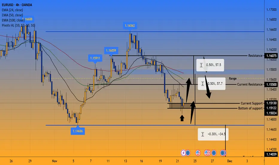 We are coming from a bearish week, and what is more important is the struggle at 1.15130, last two candle both engaged with the level and both failed to close below and also they came on some solid volume. The overall trend since September has been bearish with some nice pullbacks. Since the end of October we entered in a large range L1.14686, H1.16556. The EMA's are trading above the price confirming the overall bearishness of the pair. Given all this information and the previous structures, I'm interested in a long pullback, scenario 1 up to 1.16000 which is the Fibonacci retracement levels or re-test of the last high, I don't exclude last push to the bottom level of the range 1.14686. The idea is I'm looking for bottom reversal patterns. BUY