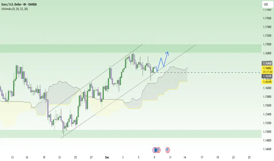 On the H4 chart, price has repeatedly bounced from the lower boundary of the ascending channel and the Ichimoku cloud, showing that the main trend is still upward. The area around 1.1630 acts as a near support level, aligning with the trendline and the upper edge of the cloud, meaning any pullback here is more of a buying opportunity rather than a reversal signal.