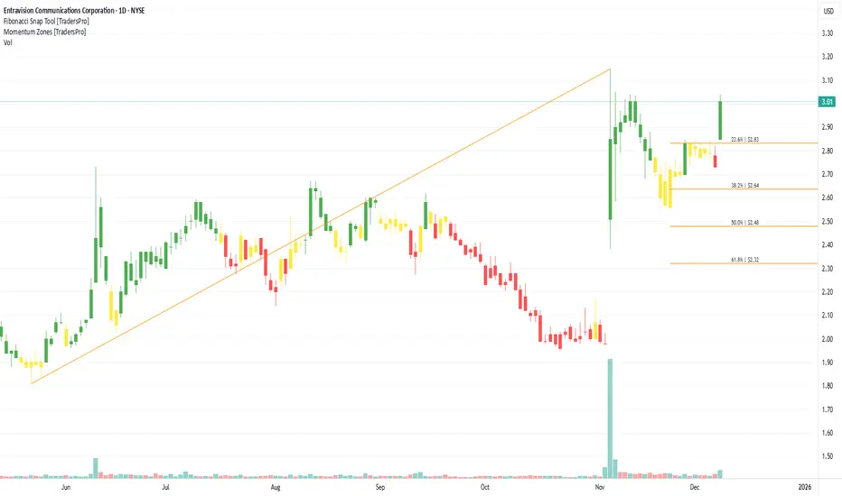 On the chart, EVC printed a confirmation bar with increasing volume as price moved above the 0.236 Fibonacci level and into the momentum zone. A trailing stop can be set just under the 0.236 line using the Fibonacci snap tool, keeping risk tight while letting momentum do its work.
