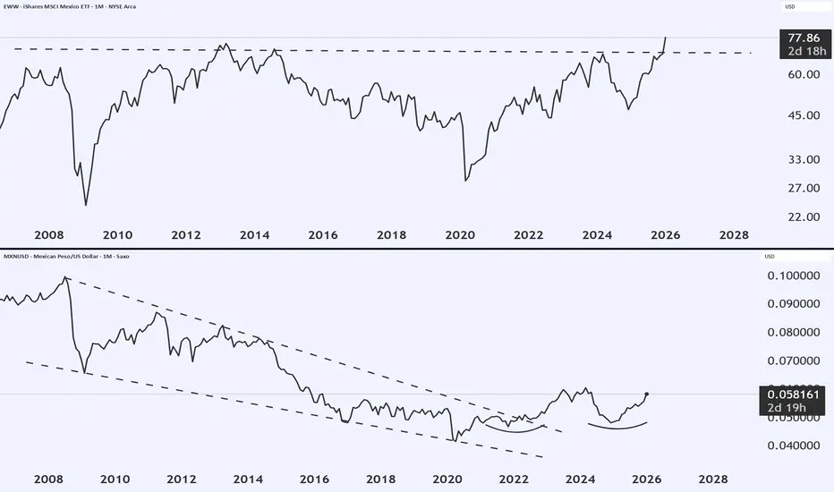 EWW (Mexico ETF) breaking out as the MXN (Mexican Peso) rises against USD.