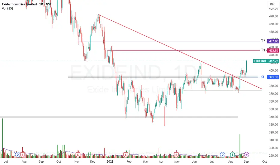 ✨ In short: After months of waiting, Exide has broken free from its range. Sustaining above 400 is a bullish sign, and the stock now looks set for 425–440 levels.