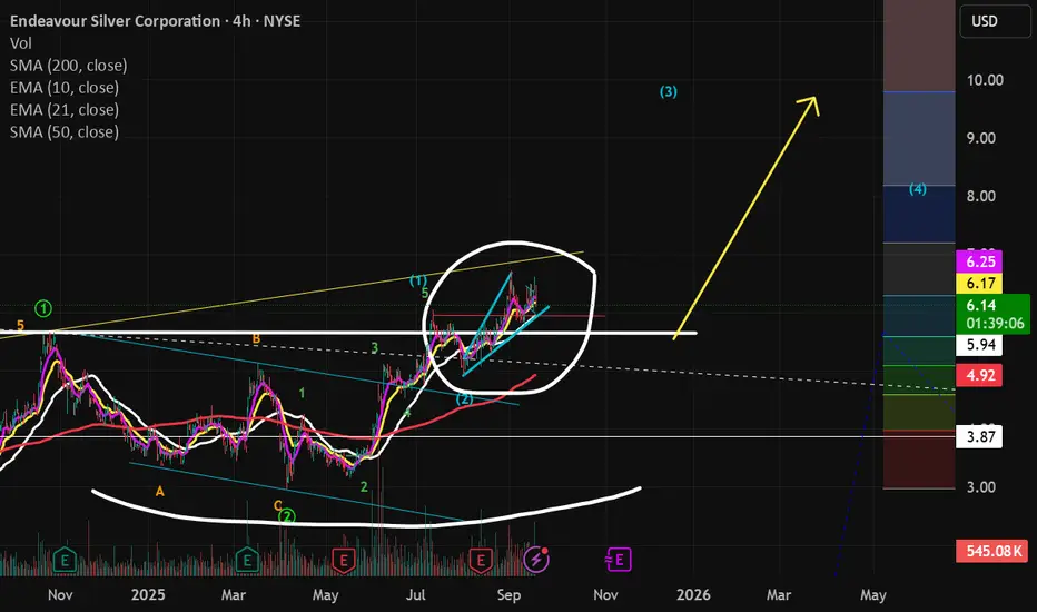 EXK is currently showing an interesting wave structure...the choppiness (see white circle) nad overlap is making this look like a leading expanding diagonal...not the most typical way to start a wave 3, but not a violation of any EW rules/guidelines that I am aware of. I first thought this might be an expanded flat correction of the wave 1 of a higher degree, but given that what would have been the B wave is exceeded 1.618 of the A wave down (ABC immediately following the wave 1 of a higher degree), I must rull out the expanded flat option and go with the leading diagonal...but I admit that I do not like it. Lets continue to watch closely.