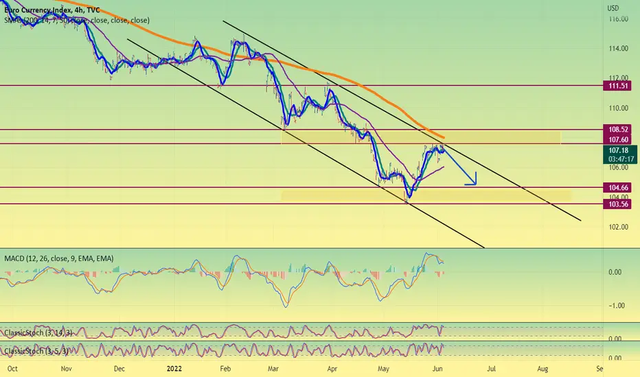 exy has reached the resistance zone 107.60 and just little above it is 108.52. it seems there is alot of rejection happening from the resistance 107.6, it'll be quite hard for price to reach 108.5 resistance. looking at Macd if price reaches the bearish divergence the price can reach back to 104. This is possible since weekly price is still in bearish zone.