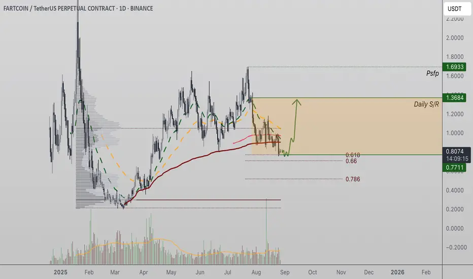 Fartcoin has reverted to the $0.77 region, a level reinforced by both Fibonacci retracement and daily support. Multiple daily closes above this zone suggest demand is present, keeping bullish continuation on the table.