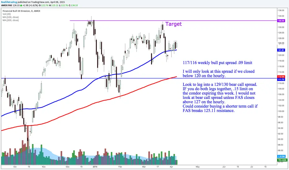 Look to leg into a 129/130 bear call spread. IF you do both legs together, .15 limit on the condor expiring this week. I would not look at bear call spread unless FAS closes above 127 on the hourly.