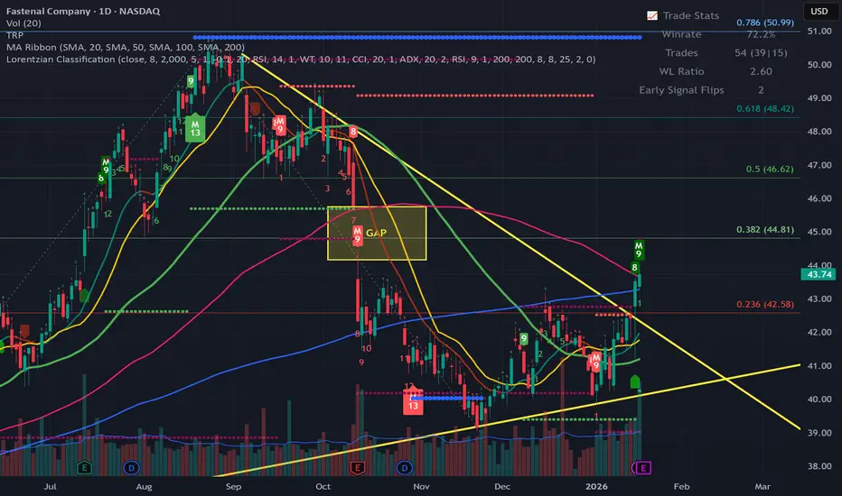 After months of consolidation and lower highs, FAST has broken its descending trendline and is building a higher low structure.