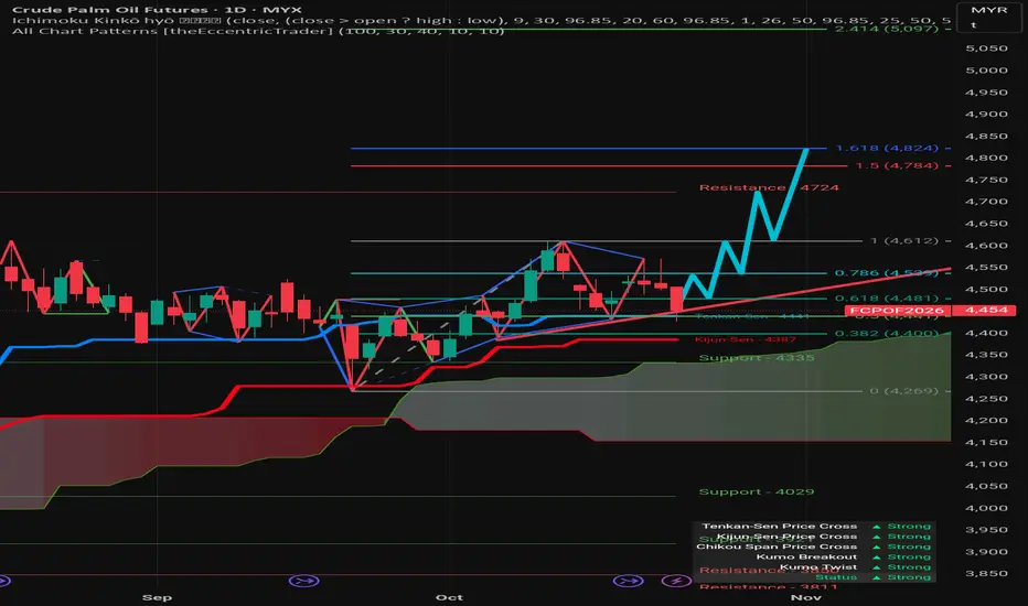 Kumo (Cloud): The shaded area that acts as a dynamic support/resistance zone. The current price is trading above the upper edge of the cloud (Senkou Span A/B), which is generally bullish.