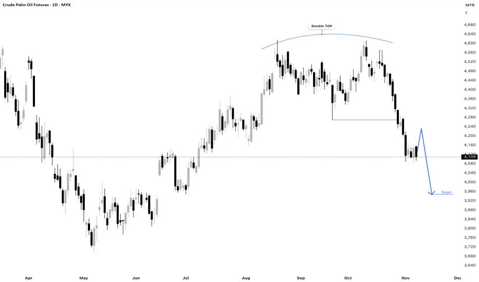 FCPO1! is bearish. However the bearish momentum might be weaken and needs to reenergised. Expecting that price to make a retracement higher before going lower again. This will create a lower high before continuing lower towards below 4000.