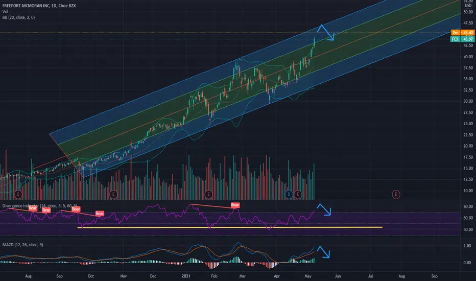 RSI is overbought, but may have a little higher to go. (It is showing Bearish Divergence)