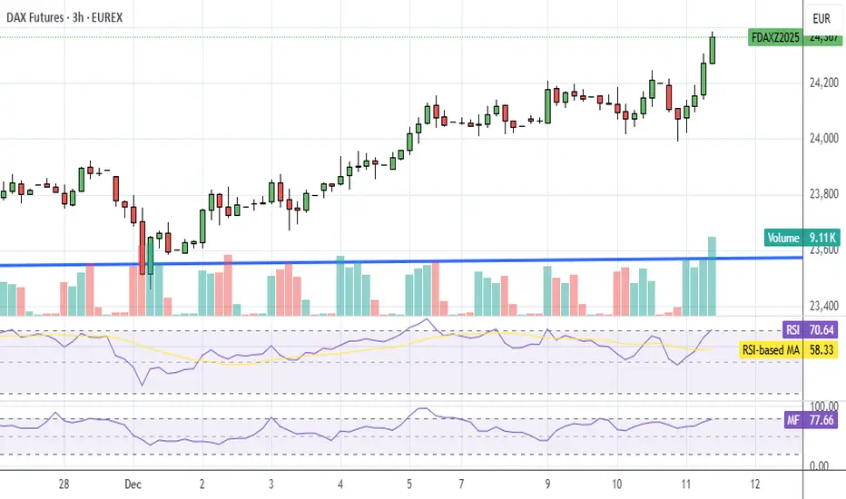 FDAX hit overbought on MFI and RSI. Remember what happened last week when they sold off before their market close on Friday, so don't be surprised to see a midday dip tomorrow or possibly another gap down for the market.