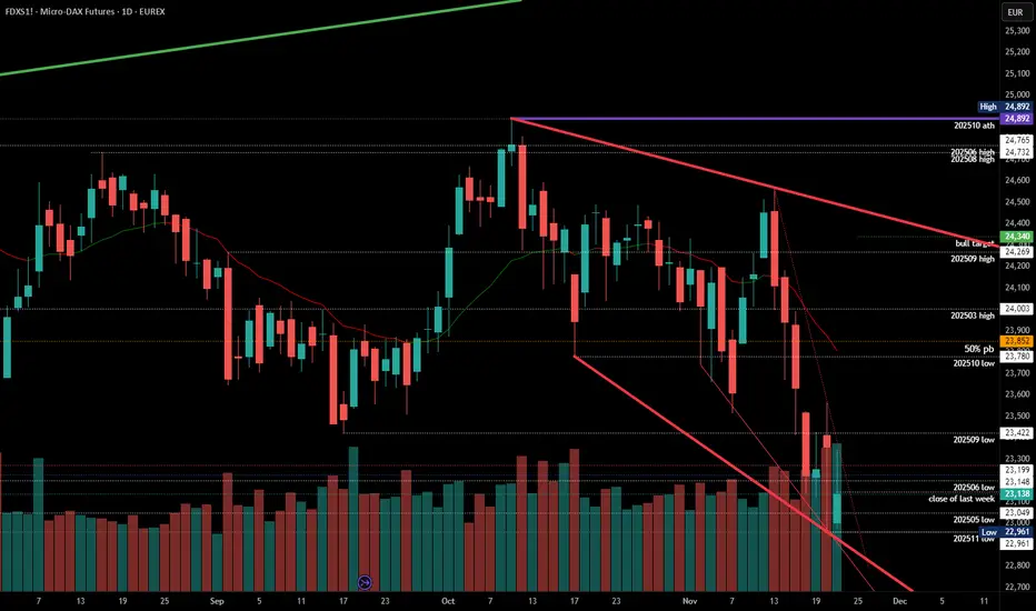 bull case: If I had to trade, I’d be inclined towards longs more than shorts. 23000 is an obvious level to bounce from and we did so last week and Friday’s price action was also showing no acceptance at or below 23000. First target for the bulls is to break above the bear wedge around 23400 and then to make higher highs above 23600 again. If they can, there is no reason why we can not melt for 2400 or even 24200 to test the shallow bear trend line from the ath again.