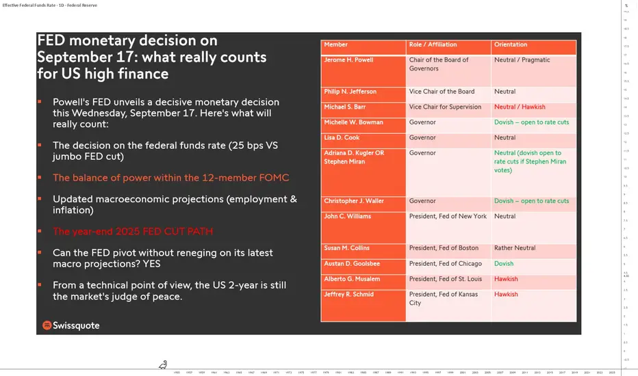 The underlying question is simple: will the Fed settle for a limited 25 basis point cut, or surprise with a more aggressive “jumbo cut”? The decision will not only concern the immediate level of rates but also the message sent to markets: the path of monetary policy for the remainder of 2025, consistency with inflation and employment projections, and above all, the balance of power among the 12 FOMC voting members. Recall that 7 votes out of 12 are needed to approve a rate cut, and Jerome Powell counts as only one vote among the 12.