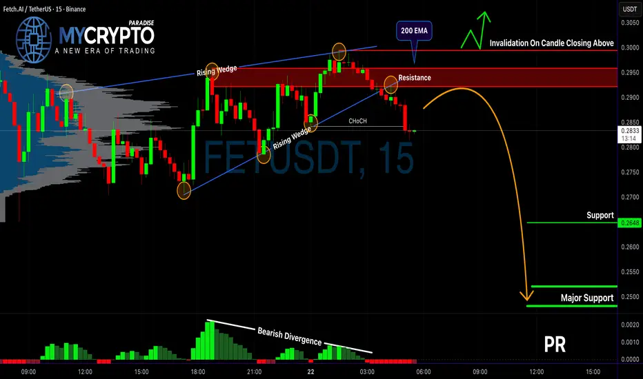 💎FETUSDT has officially broken out of a rising wedge pattern—a well-known bearish structure. This breakdown didn’t happen in isolation. It was accompanied by a clear bearish divergence, showing that while the price pushed higher, the underlying momentum was already fading. That’s a red flag for anyone still thinking bullish.