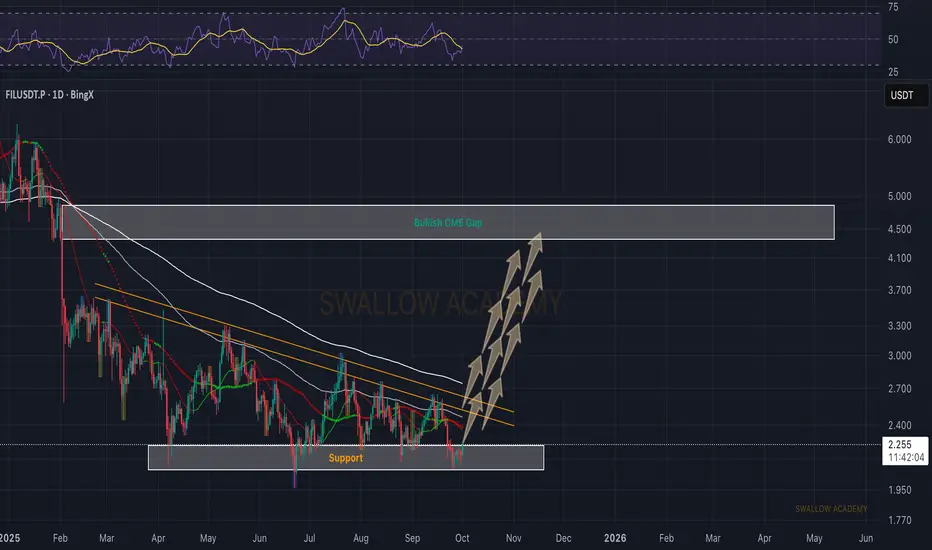 FIL is sitting right at the support zone, where buyers continue to defend the level. As long as this zone holds, we are looking at the possibility of a bounce toward higher targets. The key for continuation will be breaking above the trendline resistance and reclaiming the EMAs, which would open the way toward filling the bullish CME gap around $4.5–5.