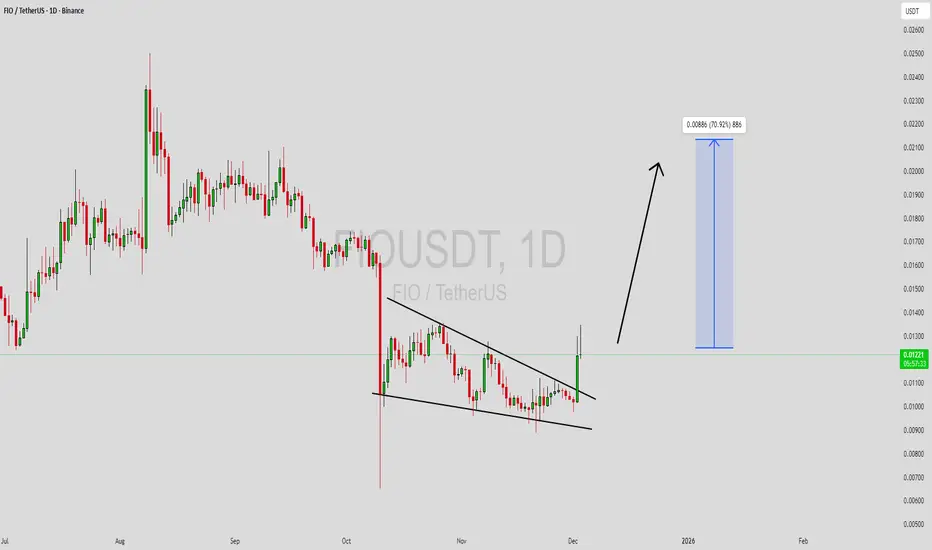 FIOUSDT is forming a clear falling wedge pattern, a classic bullish reversal signal that often indicates an upcoming breakout. The price has been consolidating within a narrowing range, suggesting that selling pressure is weakening while buyers are beginning to regain control. With consistent volume confirming accumulation at lower levels, the setup hints at a potential bullish breakout soon. The projected move could lead to an impressive gain of around 60% to 70% once the price breaks above the wedge resistance.