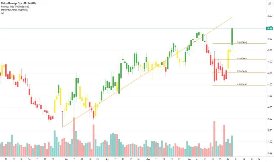 On the chart, a confirmation bar with rising volume points to bullish momentum. The price has moved into the momentum zone by breaking above the .236 Fibonacci level. Traders can set a trailing stop just below that level using the Fibonacci snap tool to lock in gains while staying open to further upside.