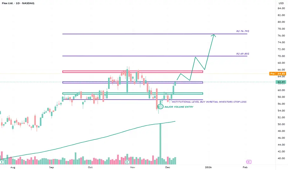 If buyers temporarily lose strength but the demand zone remains intact, Flex may consolidate in a sideways range between $58.50 and $65.50. This would represent an accumulation phase where institutions absorb supply before initiating the next leg upward. In this scenario, price may retest the red resistance band multiple times while maintaining support at the purple and teal levels. As long as the $58–60 zone holds, the broader structure continues to favor an eventual bullish breakout toward higher targets.