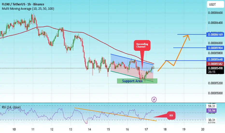 There is a key support zone in green at 0.00005200, representing a strong support point.