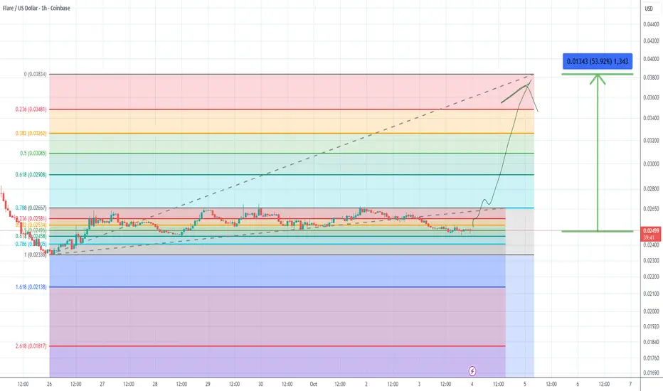 I am projecting a 50% move coming soon for Flare. 1 hour chart shows price action stalling around .618 fib level so I think we are about to bounce and move back up as soon as this weekend or next week.