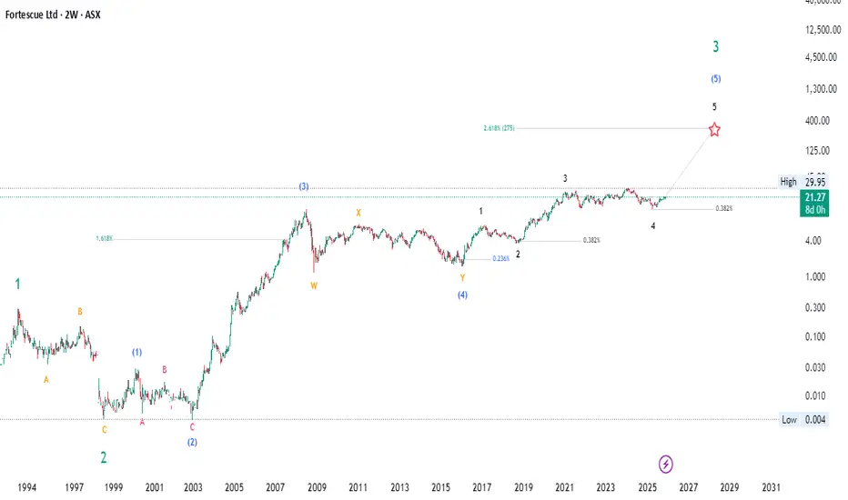 FMG remains in a strong higher-timeframe Wave 3 expansion, with the internal macro structure developing cleanly. Macro Wave (4) has already completed after a controlled corrective phase that held within the 0.236–0.382 retracement zone, reflecting continued institutional accumulation rather than distribution.