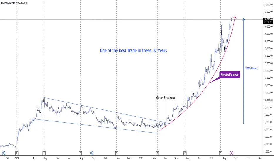 Return magnitude: The move from breakout base to current print approximates a 200% run, per the annotation, consistent with parabolic behavior.