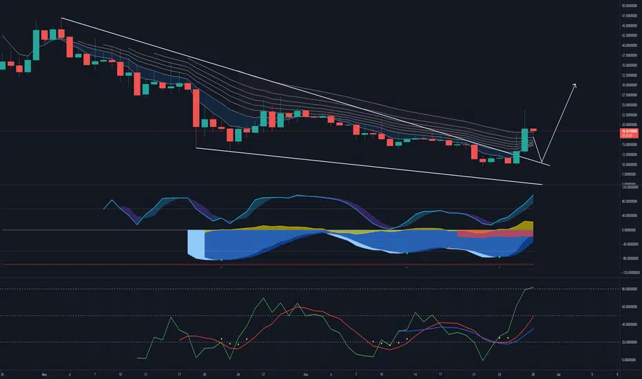 After over a month of downtrend to a low of about $9.60, FORTH pumped over 100% to $23+ in a day! This pump seems to have broken out of the descending wedge. Watch for a possible bounce off the top trend line.
