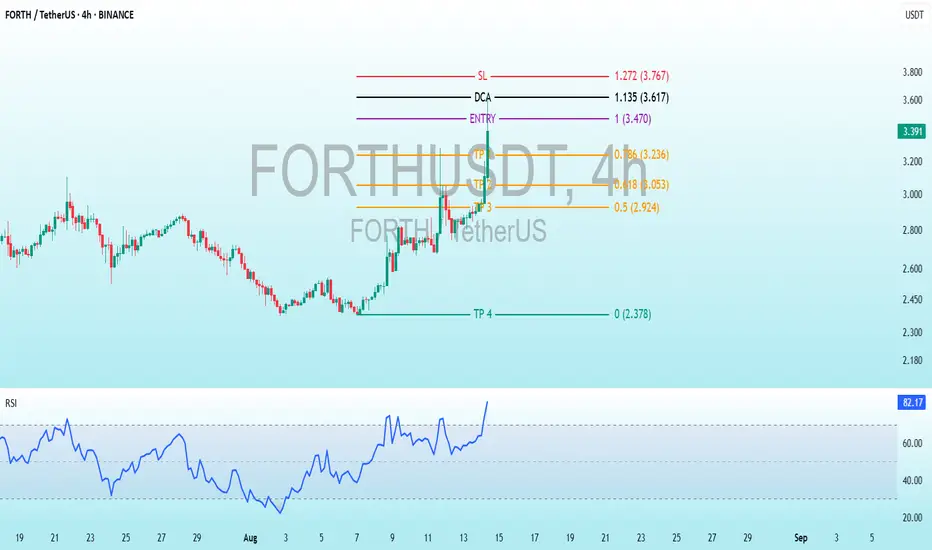Strategy: The chart uses Fibonacci levels to determine entry, exit, and loss points. The entry is set at 3.470 USDT, with a DCA at 3.617 USDT if the price continues to rise, and a stop loss at 3.767 USDT to protect capital.