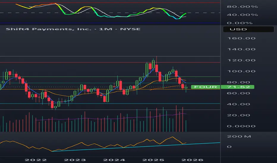 Four has been setup nicely with a trace back to the golden fib. This sector alongside PayPal is beaten down. I note higher lows on the monthly with reset volatility. A clear trend for momentum is drawn.